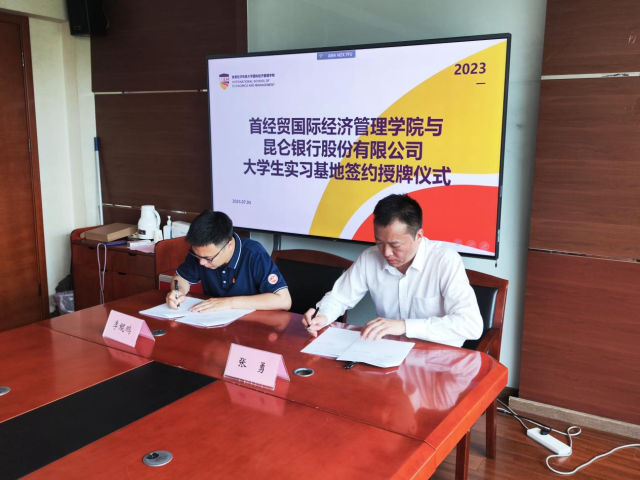 During the signing ceremony, Kunpeng LI first provided a brief introduction of the college. The International School of Economics and Management was established in 2012 and is one of the youngest colleges at Capital University of Economics and Business. It is committed to building a platform for international talent cultivation, a platform for high-quality research, a platform for attracting overseas experts, and a platform for innovation and openness. Kunpeng LI also expressed gratitude to Kunlun Bank for providing off-campus internship opportunities. Following that, Yong ZHANG introduced Kunlun Bank and expressed gratitude for the high-quality interns provided by the International School of Economics and Management. Finally, they signed the internship agreement, and discussed future cooperations.