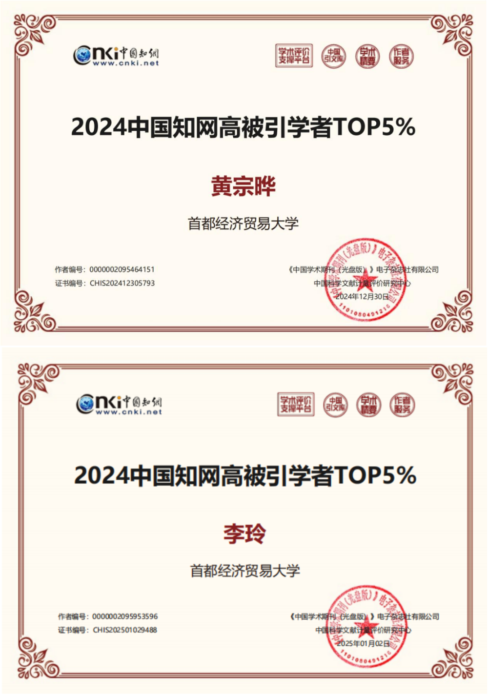 近日,“2024中国知网高被引学者”名单在网上预发布。麻豆a片 教师黄宗晔、李玲成功入选应用经济学高被引学者TOP5%名单。