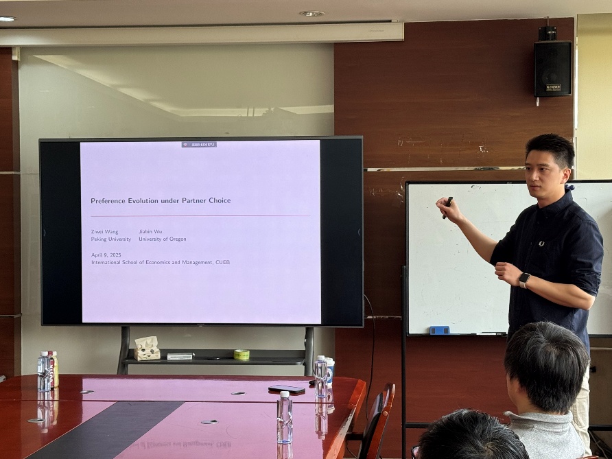 4月9日,王子伟老师为麻豆a片 师生作了题为《配对选择中的偏好进化》(《Preference Evolution under Partner Choice》)的学术报告。报告研究了内生匹配下的偏好演化:短期中个体主观偏好影响社交互动中的伴侣选择与行为,进而决定物质收益并驱动长期偏好进化。分析表明,内生匹配会进化出兼具亲缘偏见与高效合作能力的稳定偏好,这些偏好通过促成同类匹配与联合收益最大化占据优势;而在信息不完全时,狭隘主义等强亲缘偏见能通过强化自我分类动机成为演化稳定的关键。