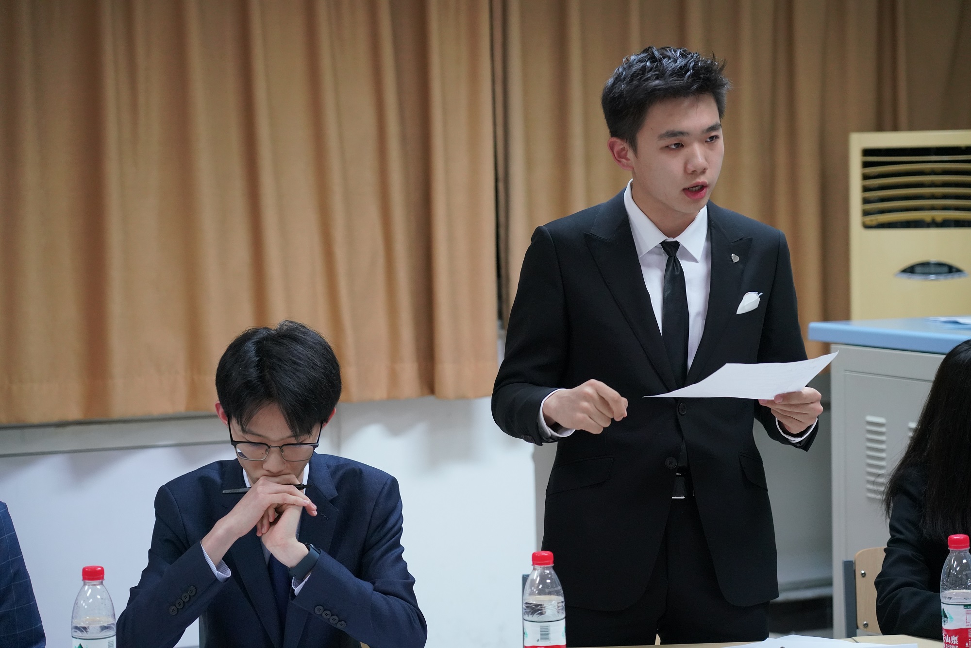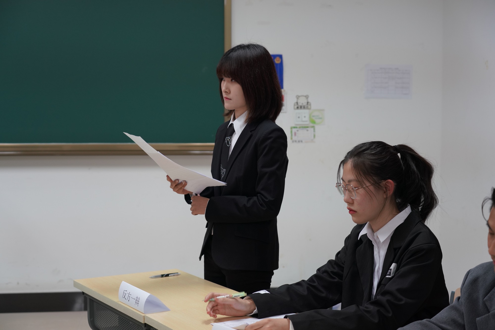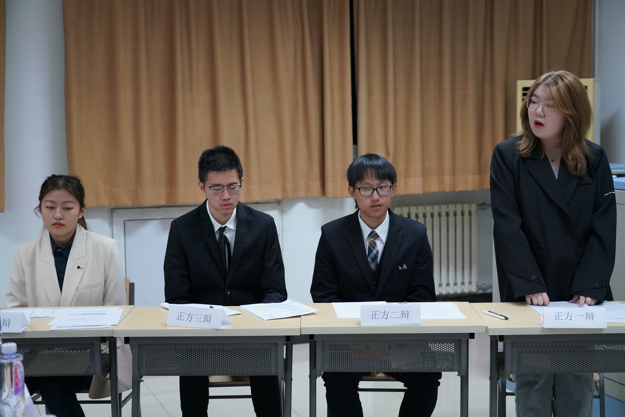 第二场辩论,二班的李欣桐、王冠杰、陈嘉迅、范东海作为正方,对决一班的反方辩手于滴、汪涵、方晨宇、刘思佳。正方辩手李欣桐针对“佛系是年轻人的幸福之道”这一论点,深入分析了佛系生活是否能够提升当代青年人的幸福感。从“佛系可以提升幸福感”与“减少不必要的焦虑”两方面罗列证据,展开论述。反方辩手于滴也不甘示弱,紧扣“佛系不是年轻人的幸福之道”的主题,以“佛系不能给当代青年带来心灵满足”进行论证,由“青年应当在遇到竞争、压力时不选择佛系,而选择迎难而上”和“青年作为社会进步的主力军、国家的栋梁,要有思进取、积极贡献,为国家建设添砖加瓦”这两方面进行了逻辑严明的论证。