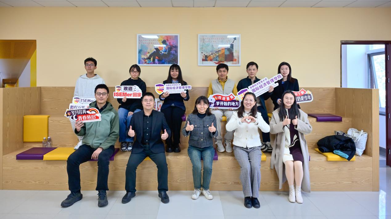 签到仪式在博远楼东侧学院专属摊位举行,这里化作 “影像留痕”打卡点。学院师生与志愿者热情迎接校友,送上精心准备的伴手礼——印有“ISEM”标识的帆布包、定制明信片、文件袋,以及围绕学院IP形象“鲸”设计的便签本与钥匙扣,每一份礼物都承载着学院的温情问候。校友们手持礼物,与熟悉的校园场景合影,定格重逢的温暖瞬间。