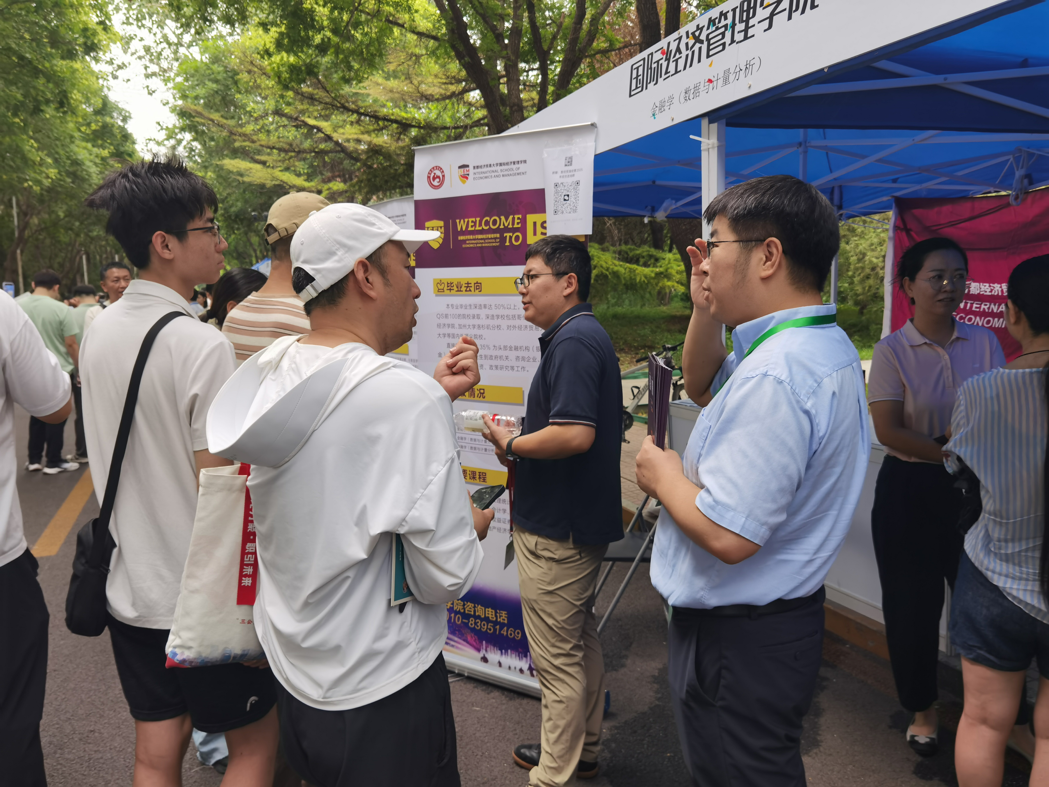 6月26日上午,麻豆a片 在麻豆a片 校园开放日活动中,面向2025届高考考生及家长开展了本科招生现场咨询。学院党委书记姜蓓蓓、院长马庆寅、党委副书记付明岩、副院长高静、副院长李委明、金融系两位主任黄宗晔和庞蔡吉、团委书记张雅淇、教学秘书胡一晗以及在校学生代表共同参与了此次活动。