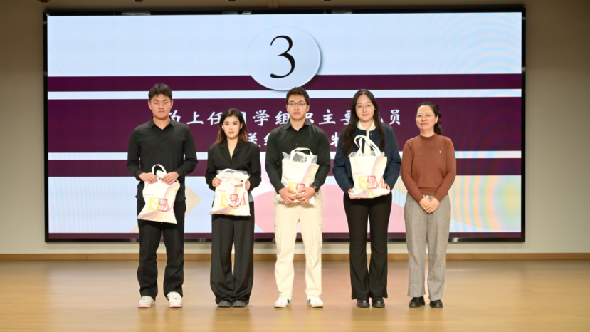 付明岩为上一任团学组织主要学生干部代表颁奖,并赠送纪念礼物。上一任研究生会主席汪若晨、学生会主席团成员李思仪、团委副书记岳知上、志愿者团团长陈明泽依次发言。他们总结了上一届团学组织的工作成果,并分享了自己在学生工作中的宝贵经历和成长锻炼,期待新一届团学组织全体成员再接再厉,共创辉煌。