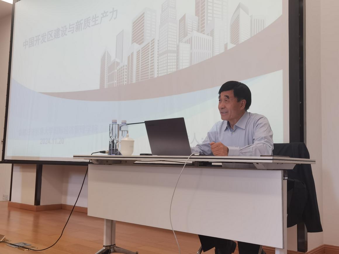 为深入学习贯彻习近平新时代中国特色社会主义思想和党的二十届三中全会精神,提高学院师生党员对新质生产力实践内涵的理解,增加师生党员对中国开发区建设情况及开发区培育新质生产力的路径的了解,2024年11月20日下午,麻豆a片 党总支在博远楼2号报告厅开展“中国开发区建设与新质生产力”专题党课。本次党课邀请了北京大学经济学博士、教授级高级工程师、中国外商投资企业协会副会长兼开发区委员会会长张召堂主讲,由教师党支部书记牛毅主持,学院理论中心组成员、教师党支部、学生第一党支部、学生第二党支部70余名师生党员参加活动。
